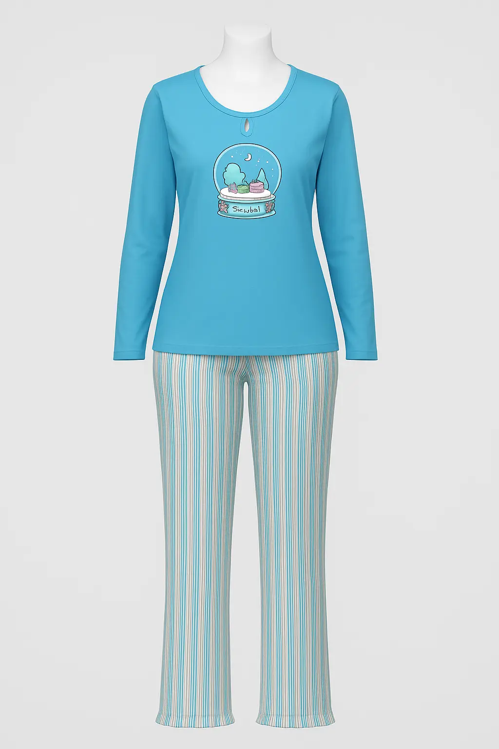 Unwind in style with our Aqua Blue Cotton Nightwear Set, crafted from 100% pure cotton for ultimate comfort and breathability. The set includes a long-sleeve aqua blue top with a charming snow globe graphic and a subtle keyhole neckline for a touch of elegance. Paired with striped pajama bottoms in complementary hues, this nightwear ensures both comfort and a chic look for your bedtime routine.