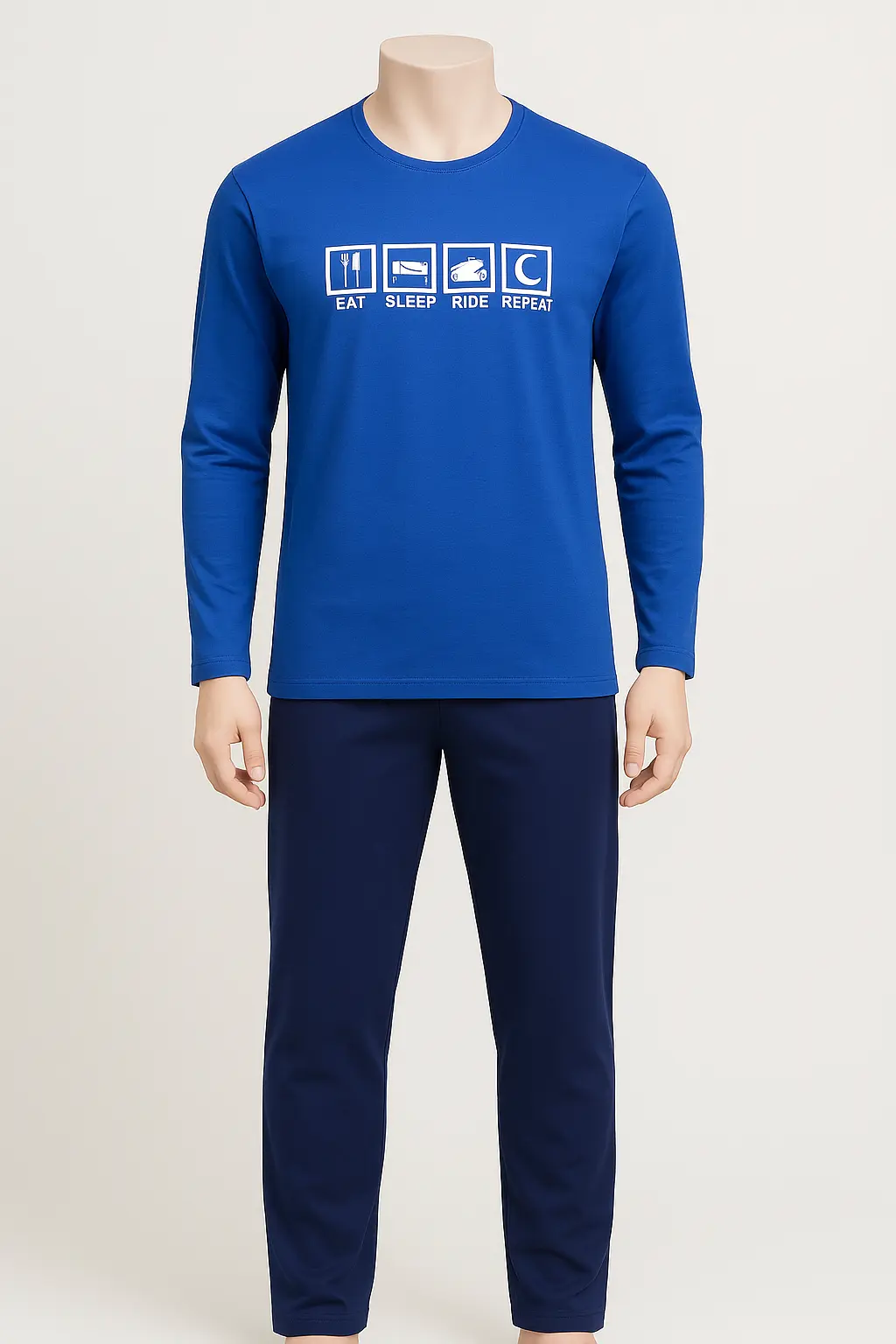 Unwind in this vibrant blue 100% cotton pajama set for men, featuring a bold “Eat Sleep Ride Repeat” graphic on a soft, breathable long-sleeve top with matching navy pants.