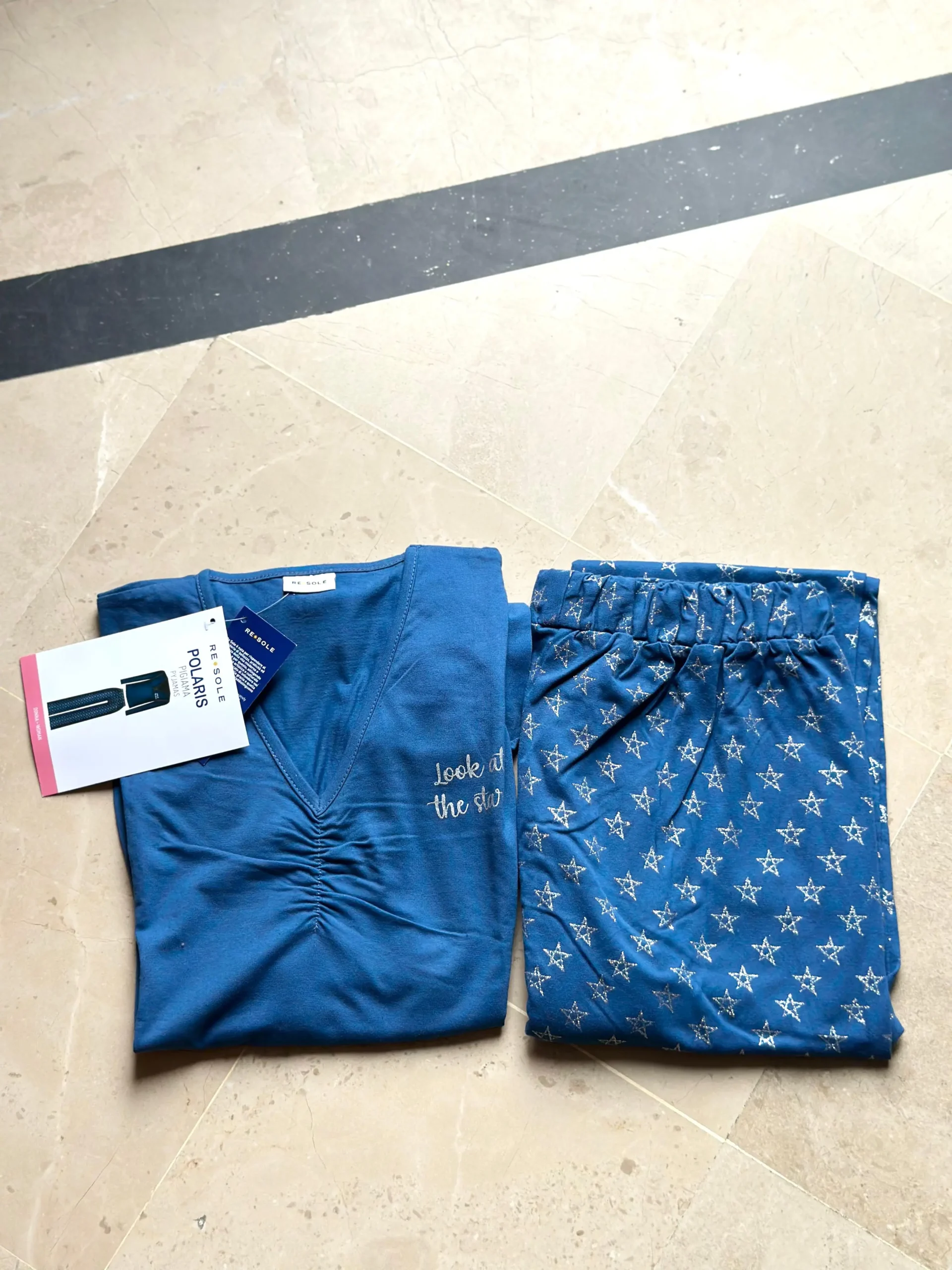 Experience ultimate comfort and style with our Blue Starry Cotton Nightwear Set. Crafted from 100% pure cotton, this two-piece set includes a soft long-sleeve V-neck top with delicate ruching and the phrase “look at the star” embroidered for a dreamy touch. The coordinating bottoms feature an all-over white star print on a rich blue base, adding a fun and elegant vibe to your sleepwear collection.
