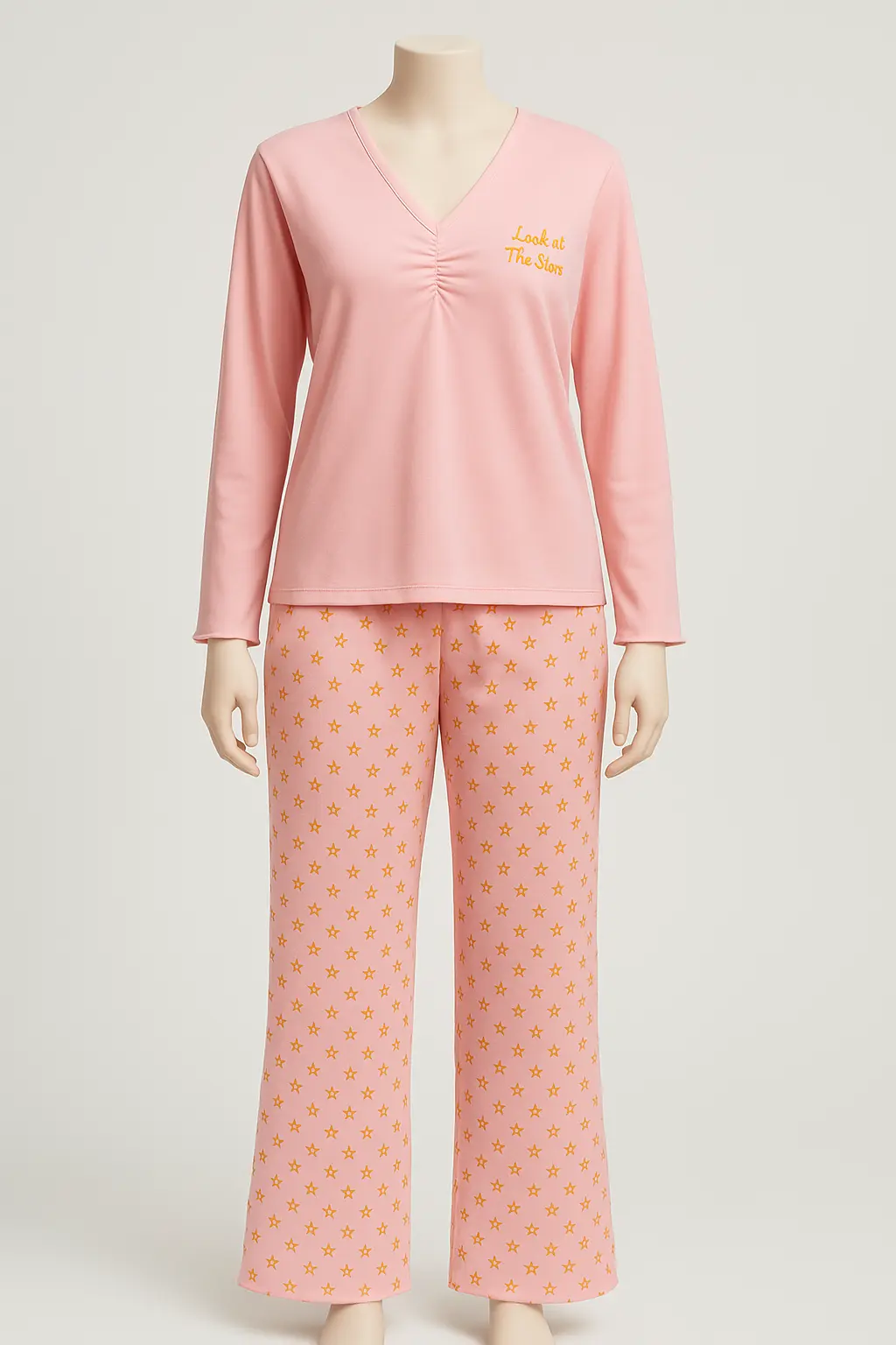Drift off to dreamland in our cozy pink nightwear set, featuring a starry print and crafted from 100% breathable cotton for ultimate comfort.